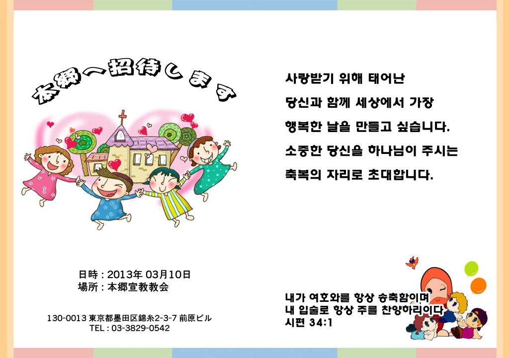 열린예배 초대장 샘플입니다 ページ情報 投稿者 朴城忍IDを検索IDを検索 日時 13-02-09 23:55 ヒット 19,834 コメント 0 本文 전체 일본어로 할예정이며 문구에 대해서는 상의후 다시 결정하겠습니다.안쪽면은 찬양 가사만 들어갑니다..용지사이즈는 B5 이며 반을 접습니다~ 添付ファイル 0310_1.psd (9.7M) 149回ダウンロード | DATE : 2013-02-17 00:52:03 リスト コメント一覧 0