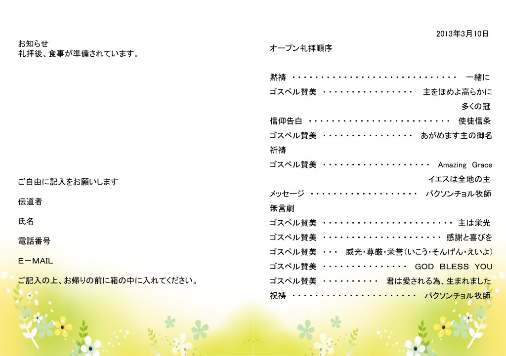 3월10일 열린예배 최종 시안입니다.. ページ情報 投稿者 朴城忍IDを検索IDを検索 日時 13-03-03 00:54 ヒット 9,775 コメント 0 本文 시작은 미약하나 점점 커가는 모습으로 노력하겠습니다..많은 참여 부탁드립니다. 添付ファイル 0310_3.psd (12.6M) 175回ダウンロード | DATE : 2013-03-03 00:54:24 リスト コメント一覧 0